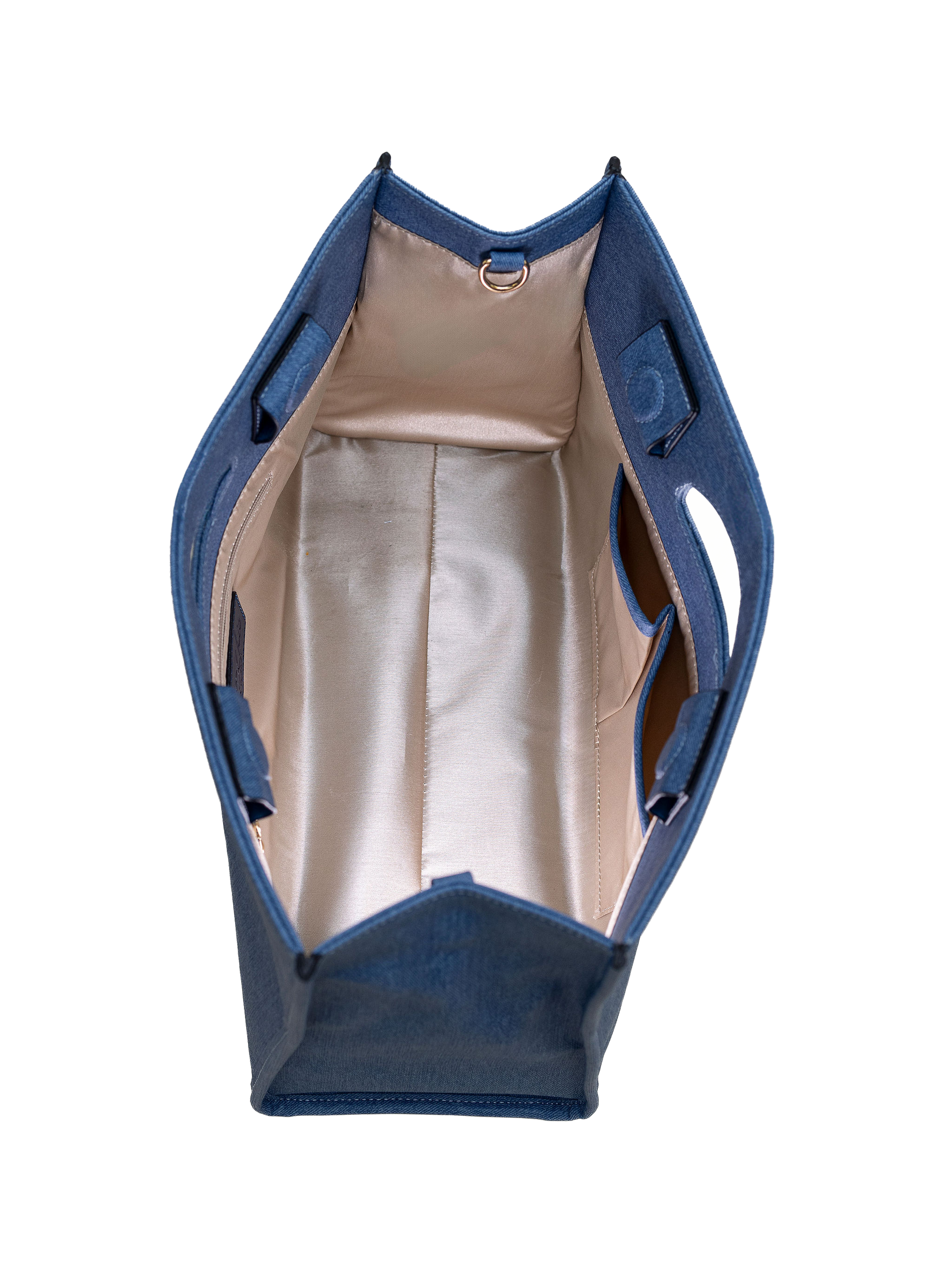 Structured large-sized tote bag. Tote can be worn in 2 ways as a top handle or with the additional bold straps attached. Inside pockets that can be used for storage
